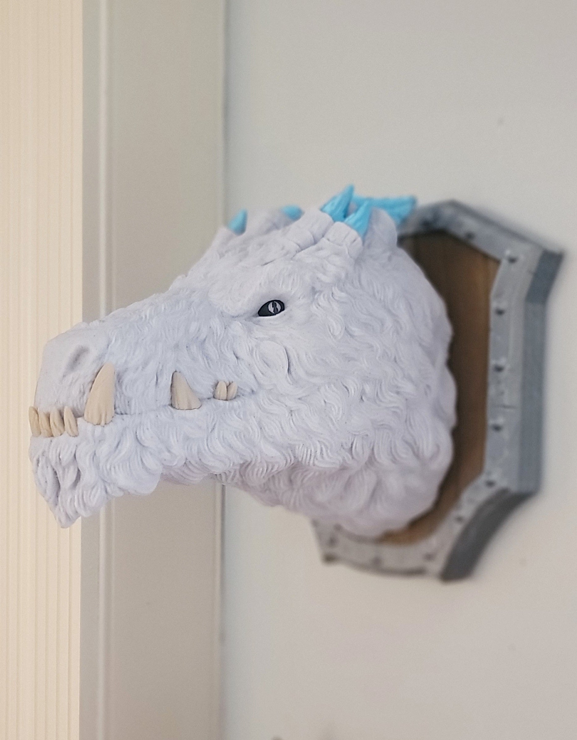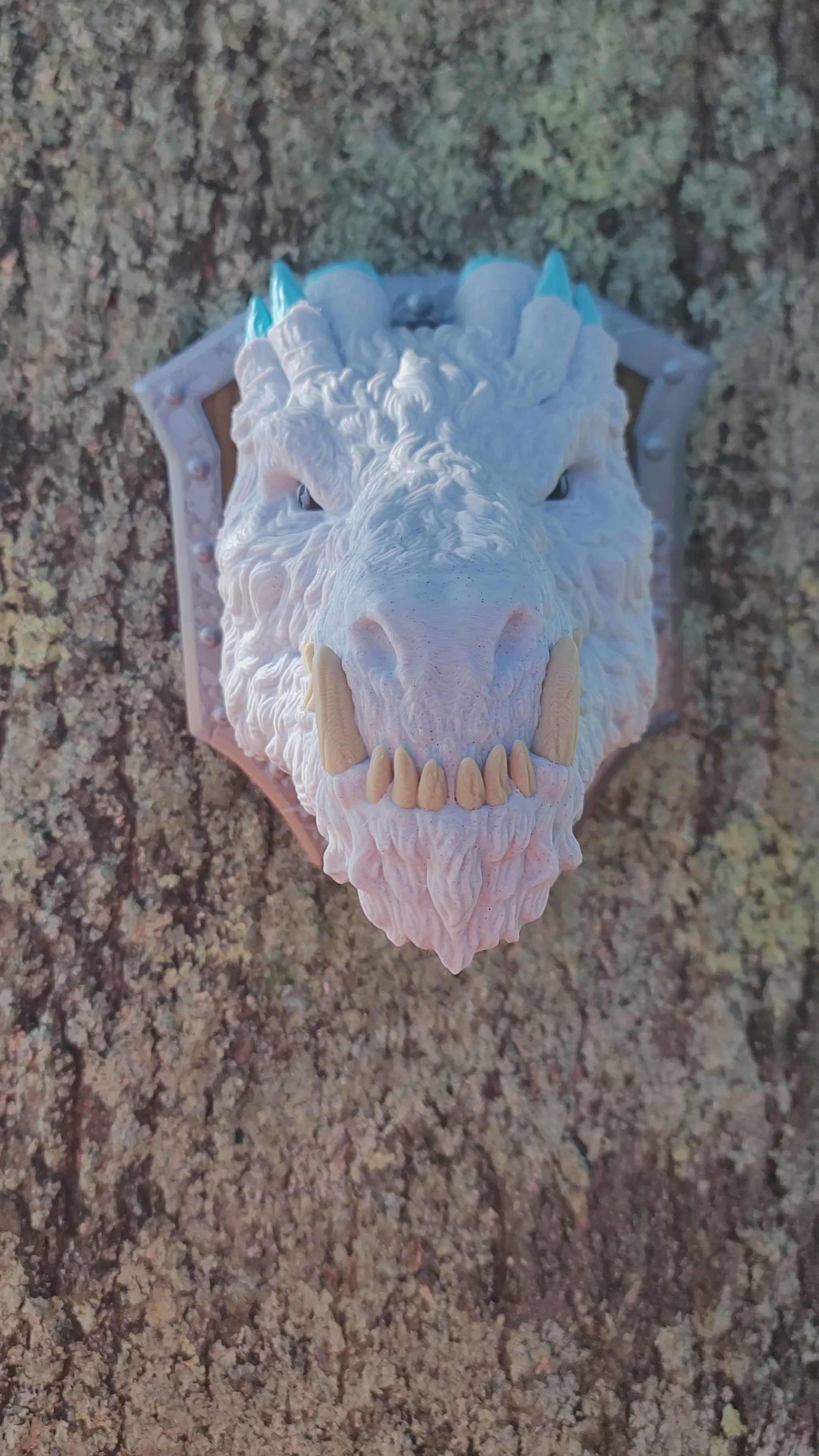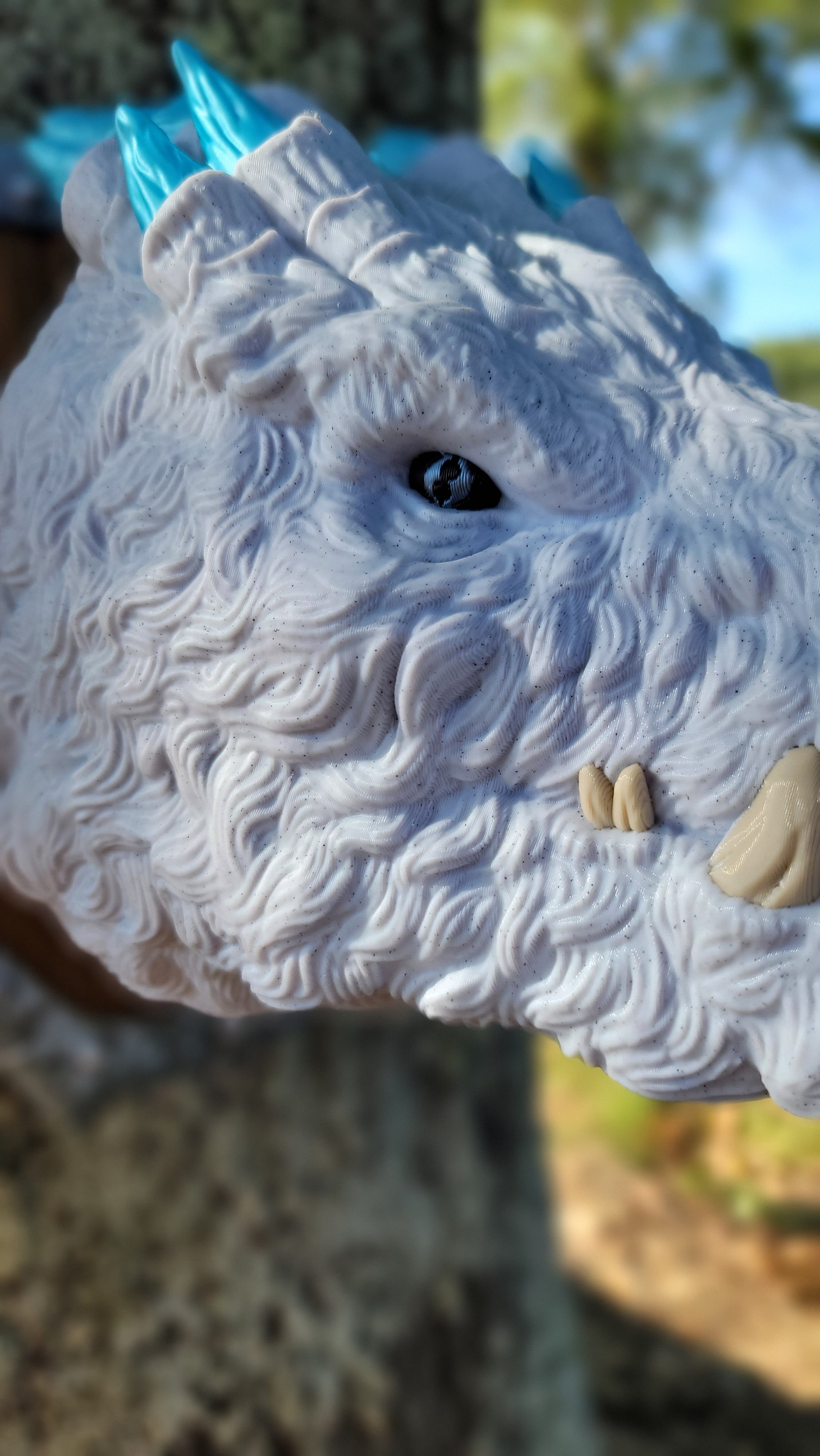 Chill out with our 3D-printed Snow Dragon head! Adorned with frosty fur and an icy, regal demeanor, this dragon brings a touch of wintry magic to your space. Perfect for adding a cool, mythical vibe to any room, it’s a frosty fusion of fantasy and art. Embrace the cold and let this dragon’s frosty breath transform your décor! ❄️🐉✨